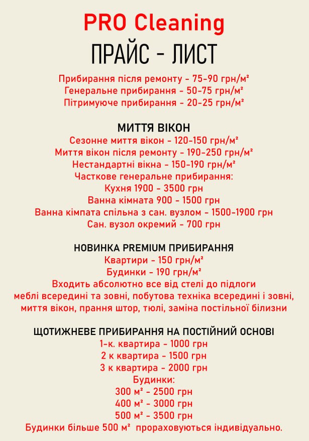 Деякі роботи не входять у вартість звичайного прибирання, так як не виконуються регулярно!